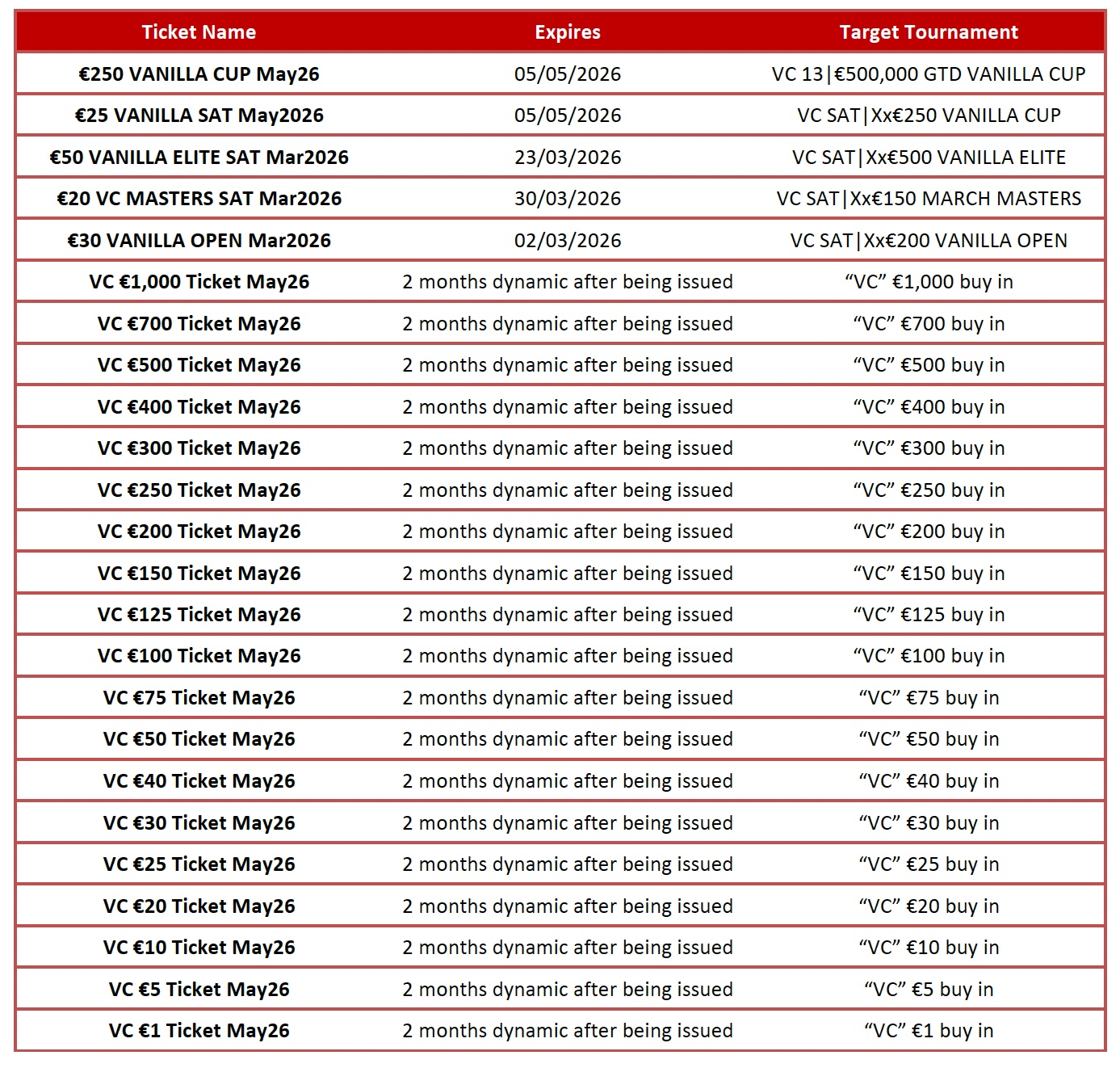 - “€250 VANILLA CUP May26”, “€25 VANILLA SAT May2026”, “€50 VANILLA ELITE SAT Mar2026”, “€20 VC MASTERS SAT Mar2026” & “€30 VANILLA OPEN Mar2026” entry tickets can only be used to enter the respective “VC” target tournament during the Promotion Period and expire after the target tournament played.